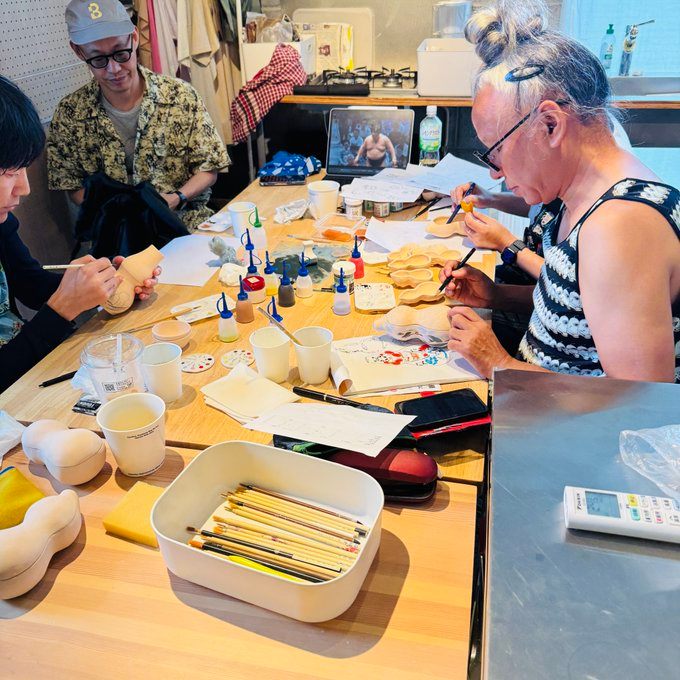 「へうたん戯画」(9.27 - 10.5)の絵付けデー第二弾だった。esou ceramicsの菊川さんにはクソ暑い中、午前中と午後の2回も家とはちみせを往復させてしまい、本当に頭が上がらない。そんなGoddess菊川さんのことを、晩ごはんの席でチャンキー松本さんが何回も「川崎さん」と呼んでいたのだが、菊川さんは指摘もせずにふつ〜に反応して会話を続けるので本当に「川崎さん」になってしまいそうだし、伊野孝行さんなどは予習復習の人間なのでつられて「川崎さん」と呼んでいた。予習復習関係ないかもしれない。ちなみにわたしは何回打っても「予襲復讐」と変換される。危険な香りがする。このままいくとわたしもうっかり川崎さんと呼ぶのだろうか。