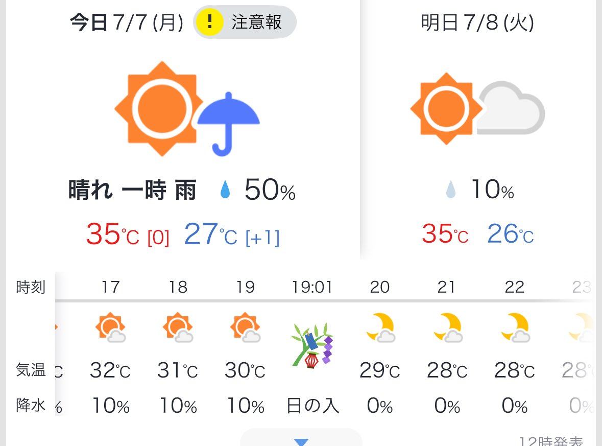 毎年七夕って、だいたい雨とか曇りとかなんだよな。ところでYahoo天気予報のアイコンがかわいかった。予報士の希望だろうか。